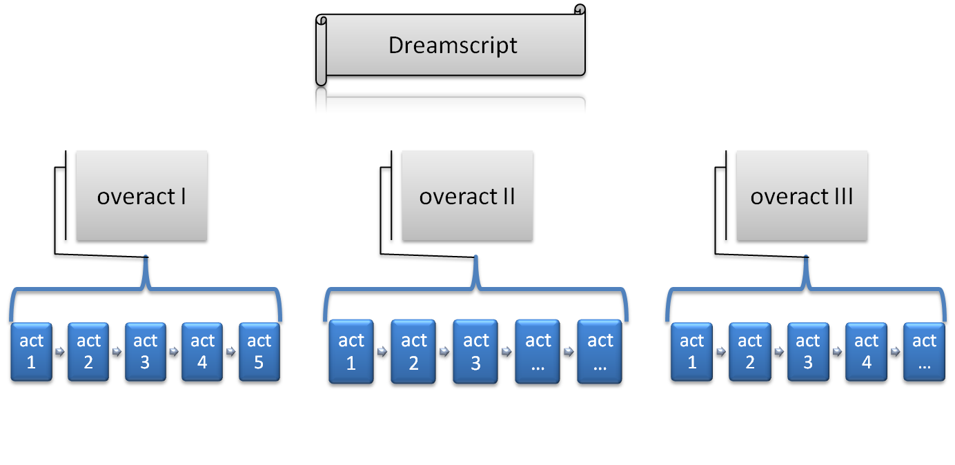 Hier ist die schematische Darstellung, die das Ganze verdeutlichen soll. Größe: 61,3 KB 18.10.2011, 13:11 Und hier ist die Visualisierung des heutigen Traumes: Ich bin bewusst eingeschlafen und habe dabei versucht acts zu bilden. Der Traumeinstieg war total wild und durcheinander. Ich sprang unglaublich hoch (act1), fiel kopfüber runter (act2) in einen Tunnel oder Brunnen(act3) und blieb am Ende doch an seinen unteren Rand hängen (act4). Dort bildete ich overact1 (springen) und ließ los. Ich fiel in tieferen Traum hinein, wo eine Expedition startete. Es kamen mehrere Männer zusammen und auch unser Pfadfinder (act1). Wir brauchten spezielle Ausrüstung: Seile, Bücher, Schuhe… usw. und packten unsere Rücksäcke voll. (act2). Dann wanderten wir zum Berg „Samochval“, das Wetter war schön, es war ein Frühling… Größe: 288,91 KB 18.10.2011, 13:11 RE: Act - Erinnerungsschleifen - Jami - 18.10.2011 Man baut die Overacts während des Traums? Zitat:Der Traumeinstieg war total wild [...] ![]() RE: Act - Erinnerungsschleifen - Don Rinatos - 18.10.2011 (18.10.2011, 13:45)Jami schrieb: Man baut die Overacts während des Traums? Ja, währenddessen! Zitat:Zitat:Der Traumeinstieg war total wild [...] hehe RE: Act - Erinnerungsschleifen - Wasser - 18.10.2011 Ich versteh das mit dem overact noch nicht so ganz. Ich hatte erst gedacht, das sei eine Überkategorie für die ersten paar acts, aber es scheint eher so eine Art Schnitt zu sein, wie die großen Striche auf dem Lineal bei den ganzen Zahlen, die über die kleinen hinausragen? |