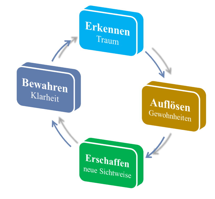 Der dritte Schritt ist die Erschaffung neuer Umgebung im Traum, oder neuen Handlungen, Verhaltensweisen. Diese wird im vierten Schritt stabilisiert und daraus können neue Erkenntnisse gewonnen werden.