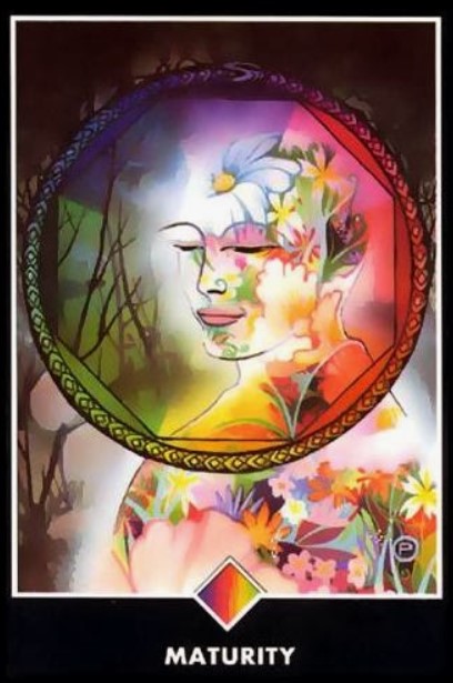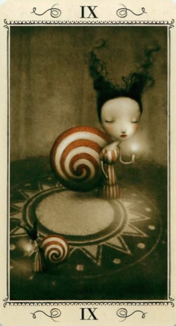 9 - Der Eremit (Artwork "Sleepwalk") - Assoziationen zum Bild: Besinnung auf mich selbst nach einer Zeit der Fixierung im Außen, Spirale dreht nach innen, Augen sind geschlossen und es wird mehr auf das geschaut, was innen vor sich geht. Was mich beschäftigt ist in der Tat wieder mal die Selbstfindung und die damit verbundene Loslösung von äußeren Umständen.