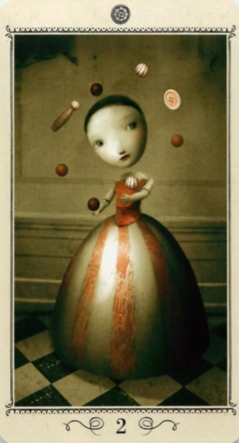 2 der Münzen (Artwork "Juggler") - Assoziationen zum Bild: Alles am Laufen halten, nicht aus dem Takt kommen, jetzt bloß keine Fehler machen und irgendwie weiter zu funktionieren, puppenhaft und fast kopflos. Was mir aktuell Bauchschmerzen bereitet ist in der Tat immer noch der innere Antreiber in mir, der mir sagt, dass ich funktionieren muss.