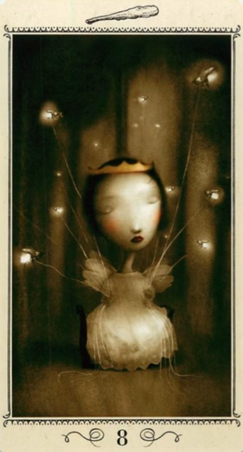 8 der Stäbe (Artwork "Firefly") - Assoziationen zum Bild: Vielseitige Ressourcen, Fokus auf mehreren Dingen, die mir gut tun. Augen geschlossen, Hineinspüren was ich brauche anstatt zu scannen was andere von mir möchten oder erwarten, ich trage die Krone. Gerade tut es mir in der Tat gut mal eher darauf zu schauen, was ich eigentlich will und worauf ich Lust habe und das dann auch zu machen ohne schlechtes Gewissen. Es klappt immer besser.