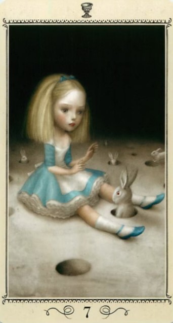 Schönes und Genuss (Venus) trifft auf Unbewusstes und Tiefe (Skorpion). Bei den sieben der Kelchen zeigt sich häufig eine Schwammigkeit in Bezug auf die eigenen Wünsche, Gefühle bis hin zu Verführung, die Trennschärfe, die zur Entscheidung befähigt, fehlt hier. Hier liegt der Schatten: Wo lasse ich mich zerstreuen oder hinreißen? Wo fehlt es mit an Trennschärfe, um eine klare Entscheidung zu treffen? Wo bin ich meinen Gelüsten verfallen? Hier hilft eine nüchterne Betrachtungsweise und die Konzentration auf eine Sache.
