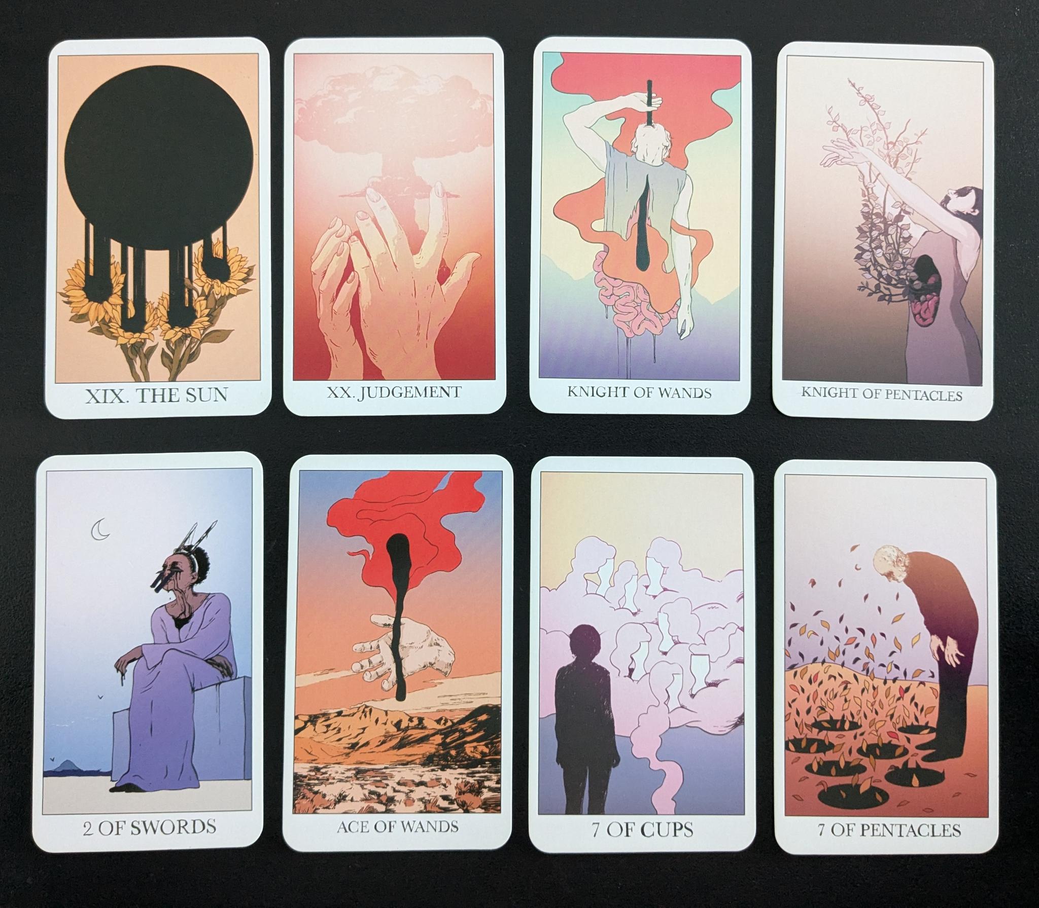 Aktuell lerne ich die Karten auf meine Weise kennen. Ich habe sie noch nicht gemischt und klassisch gelegt, sondern sie und ihre Symbolik hauptsächlich wirken lassen.