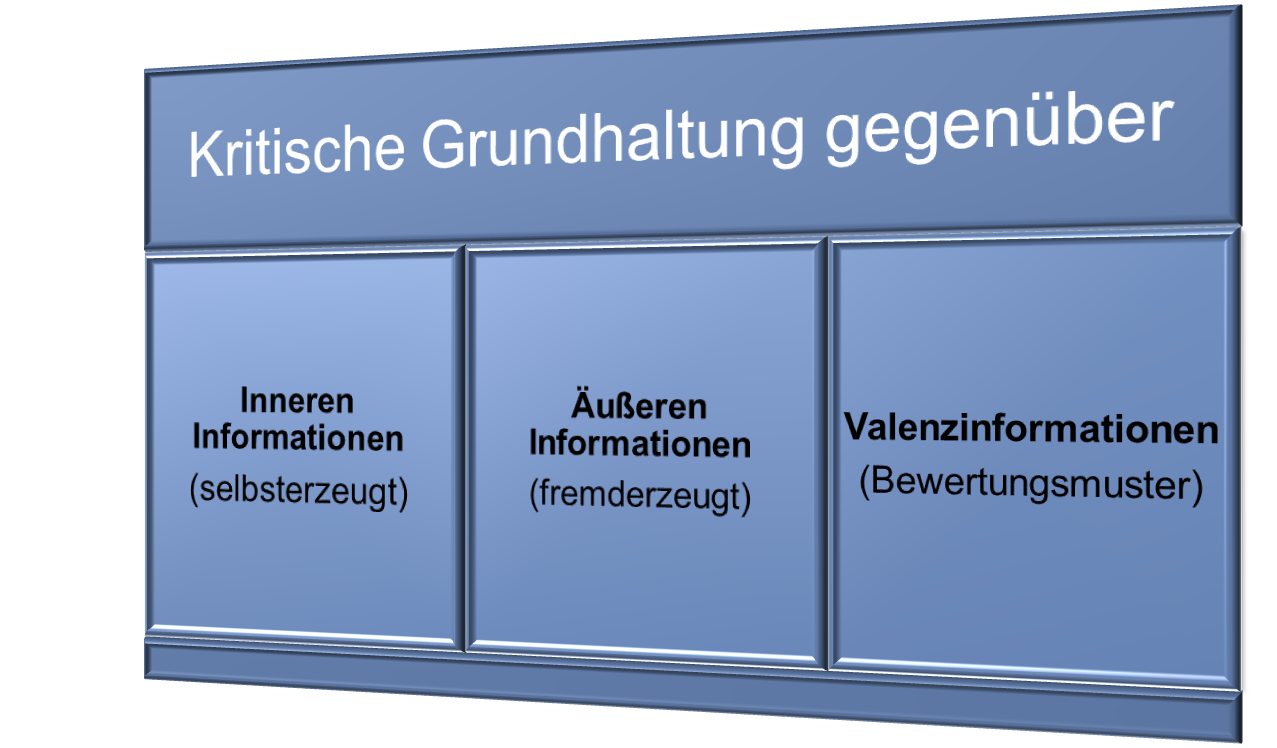 1. Innere Information enthüllt sich in eigenen Äußerungen, seien sie verbal, paraverbal oder nonverbal. Beim Training kritischen Denkens werden alle eigene Worte, Gestik und sonstige Kommunikationskanäle des Gesprächs mit einer anderen Person, aber auch die eigene Handlung und die Ergebnisse der Handlung kritisch reflektiert, ob sie aus klarem Bewusstsein kommen.