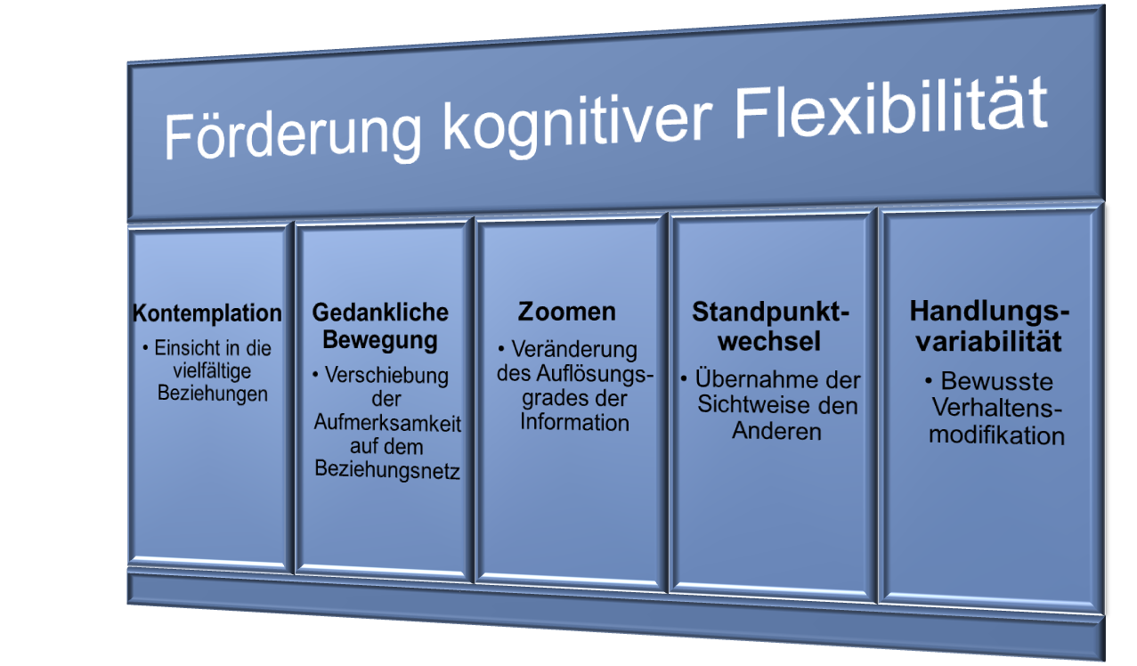 Zum zweiten besteht das Training kognitiver Flexibilität aus der bewussten Bewegung auf dem aufgespannten Netz dieser Verbindungen. Es kann aber auch das Auflösungsgrand der Information verändert werden: ins Details eingezoomt, oder umgekehrt auf die Metaebene abstrahiert. Dies erhöht die Effizienz-Divergenz und somit auch den Spielraum.