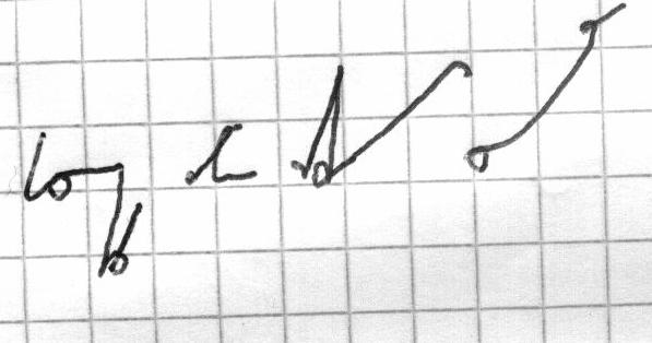 jedes 'i' und jedes 'o' geht ja einen Halbschritt nach unten. Ich beschreibe auf Karopapier jede zweite Zeile. Meine Zeilen bestehen aus drei Halbschritten, ich würde also irgendwo zwei Zeilen tiefer landen wenn ich das Wort in einem durchschriebe. (Bei liniertem Untergrund beschreibe ich jede Zeile, deren Abstand ich ungefähr wie zwei Zeilen auf Karopapier behandle.) Sinnigerweise kann man die Wortabschnitte auch etwas näher aneinanderbringen als in meinem Beispiel, oder gar überlappen lassen. Habe ich in der Zeile über mir Platz durch ein Komma oder noch mehr Platz durch einen Punkt, schreibe ich a-/ei-/ö-/eu-lastige Worte gegebenenfalls auch bis dahin hoch und zum Platzsparen auch unter diesem Wort weiter. Drei oder mehr für die Stiefografie «ungünstige» Vokale in Folge kommen allerdings selten vor.