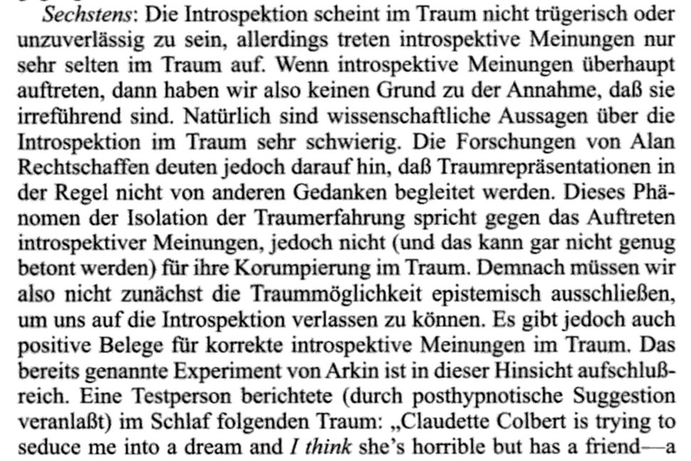 Ich bin gespannt was das Buch noch mitsichbringt, aber mit fehlt die Berücksichtigung der Klarträume. Denn die Klarträume zeigen noch ein ganz neuer Aspekt: ganz unten kann logischer Bewusstsein eingeschleust werden. Das sollte die ganze Introspektion aufgrund revolutionieren.
