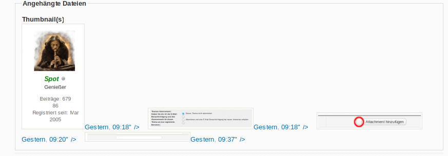 Mir sind aber noch zwei Artefakte aufgefallen, die aber wirkliche Kleinigkeiten sind: Neben den Thumbnails der Attachments in Betirägen stehen aus irgendeinem Grund schlecht formatierte Daten (vermutlich die Upload-Zeitpunkte). Und die Buttons beim Entfernen von Attachments scheinen fehlerhaft dargestellt zu werden. (Letzteres könnte aber auch an meinem Browser liegen, d.i. im Wesentlichen Firefox 54.0.)