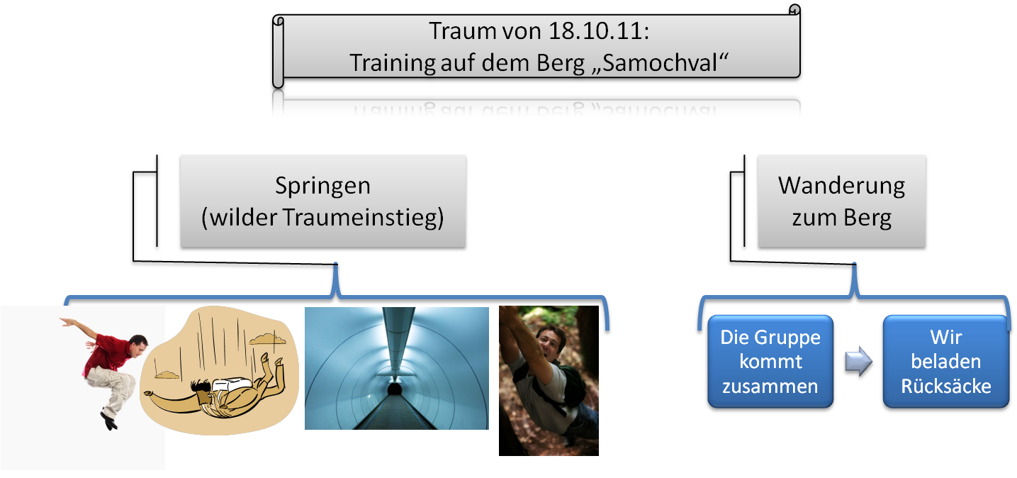 Hier ist die schematische Darstellung, die das Ganze verdeutlichen soll. Größe: 61,3 KB 18.10.2011, 13:11 Und hier ist die Visualisierung des heutigen Traumes: Ich bin bewusst eingeschlafen und habe dabei versucht acts zu bilden. Der Traumeinstieg war total wild und durcheinander. Ich sprang unglaublich hoch (act1), fiel kopfüber runter (act2) in einen Tunnel oder Brunnen(act3) und blieb am Ende doch an seinen unteren Rand hängen (act4). Dort bildete ich overact1 (springen) und ließ los. Ich fiel in tieferen Traum hinein, wo eine Expedition startete. Es kamen mehrere Männer zusammen und auch unser Pfadfinder (act1). Wir brauchten spezielle Ausrüstung: Seile, Bücher, Schuhe… usw. und packten unsere Rücksäcke voll. (act2). Dann wanderten wir zum Berg „Samochval“, das Wetter war schön, es war ein Frühling… Größe: 288,91 KB 18.10.2011, 13:11 RE: Act - Erinnerungsschleifen - Jami - 18.10.2011 Man baut die Overacts während des Traums? Zitat:Der Traumeinstieg war total wild [...] ![]() RE: Act - Erinnerungsschleifen - Don Rinatos - 18.10.2011 (18.10.2011, 13:45)Jami schrieb: Man baut die Overacts während des Traums? Ja, währenddessen! Zitat:Zitat:Der Traumeinstieg war total wild [...] hehe RE: Act - Erinnerungsschleifen - Wasser - 18.10.2011 Ich versteh das mit dem overact noch nicht so ganz. Ich hatte erst gedacht, das sei eine Überkategorie für die ersten paar acts, aber es scheint eher so eine Art Schnitt zu sein, wie die großen Striche auf dem Lineal bei den ganzen Zahlen, die über die kleinen hinausragen? |