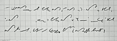jedes 'i' und jedes 'o' geht ja einen Halbschritt nach unten. Ich beschreibe auf Karopapier jede zweite Zeile. Meine Zeilen bestehen aus drei Halbschritten, ich würde also irgendwo zwei Zeilen tiefer landen wenn ich das Wort in einem durchschriebe. (Bei liniertem Untergrund beschreibe ich jede Zeile, deren Abstand ich ungefähr wie zwei Zeilen auf Karopapier behandle.) Sinnigerweise kann man die Wortabschnitte auch etwas näher aneinanderbringen als in meinem Beispiel, oder gar überlappen lassen. Habe ich in der Zeile über mir Platz durch ein Komma oder noch mehr Platz durch einen Punkt, schreibe ich a-/ei-/ö-/eu-lastige Worte gegebenenfalls auch bis dahin hoch und zum Platzsparen auch unter diesem Wort weiter. Drei oder mehr für die Stiefografie «ungünstige» Vokale in Folge kommen allerdings selten vor.