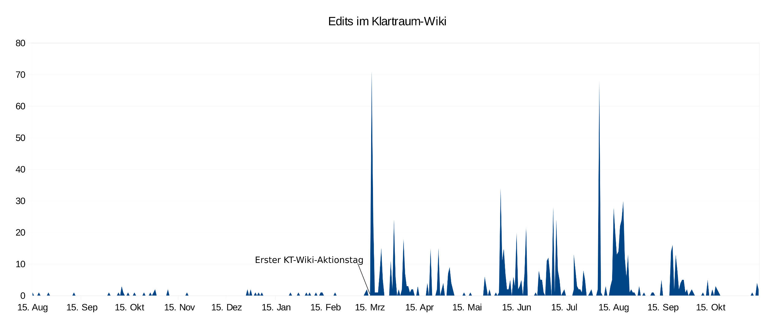 Seit dem 11.3.2014, als wir die Aktion gestartet haben, wurden 979 Seitenbearbeitungen im Wiki durchgeführt. In der angehängten Grafik sieht man, wie die Aktivität vor den Aktionstagen war und wie sie direkt nach Beginn war.