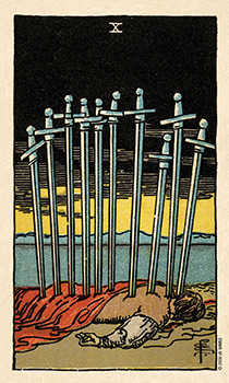 10 der Schwerter - Erste Assoziation: Auf geistige Erschöpfung folgt körperliche. Die Stufen, die ich durchlaufe ähneln sich stets und das Ende der Treppe ist immer Erschöpfung. Schwerter sind wie Gedanken. Schwerter sind scharf und eine unruhige Hand kann ein scharfes Schwert nicht führen, ohne sich selbst zu schaden. Das Abstumpfen des Schwertes kann ebenso nicht die Lösung sein. Das Pendant hierzu wäre die Betäubung und erzwungene Ruhigstellung der Gedanken durch Ablenkung und Rausch. Eine ruhige Hand kann auch ein scharfes Schwert führen, ebenso wie ein ruhiger Geist auch sämtliche Gedanken beherbergen kann, auch die ängstlichen Gedanken.