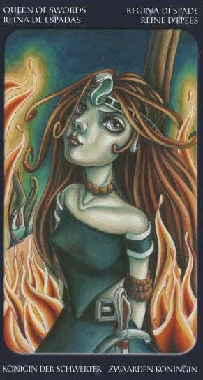 Entschlossen und angefacht wirkt diese Person. Eigentlich möchte ich keine Königin der Schwerter in diesem Sinne sein, aber in dieser Darstellung gefällt sie mir.