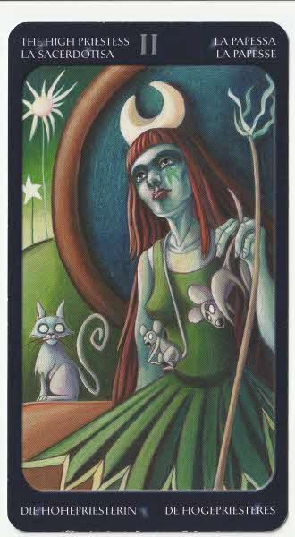 "Nur die Hohepriesterin weiß, was unentdeckt bleibt. Oder auf den Punkt gebracht: Ich weiß auch nicht, was sie da mit den vermaledeiten Mäusen anstellt, und erst die Katze!" (Um ehrlich zu sein, fand ich die Hohepriesterin schon immer sperrig, der Zugang zu dieser Großen Arkana fühlt sich für mich immer noch irgendwie blockiert an, insofern finde ich es fast witzig, dass sie als Antwort zu dieser Frage auftaucht; die Frage an sich ist natürlich Nightvale-inspiriert. )