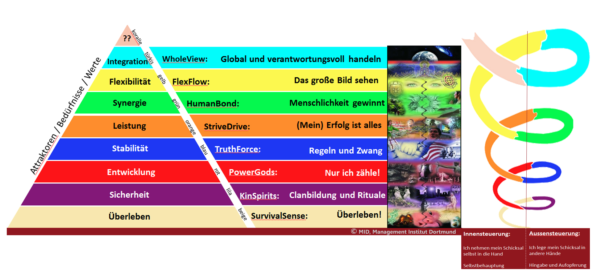 Damit meint er, dass die menschliche Entwicklung kontinuierlich und nie beendet ist. Sie verändert sich mit der Veränderung der menschlichen Existenzbedingungen und bringt dadurch neue Systeme hervor, in die die alten Systeme integriert sind. Wenn ein neues System oder eine neue Stufe sich entfaltet, dann verändern wir auch unsere Psychologie und unsere Lebensgewohnheiten, um uns diesen neuen Bedingungen anzupassen. Die unterschiedlichsten Lebensformen in diesem potentiell offenen Wertesystem sind möglich. Ein Endstadium, das alle erreichen müssen, existiert nicht. Das Individuum, Firmen oder sogar ganze Gesellschaften, können nur auf Managementprinzipien, Motivationsanreize, Erziehungsgrundsätze und erlaubte bzw. ethische Vorstellungen positiv reagieren, die der aktuellen Stufe dieser menschlichen Existenz entsprechen!